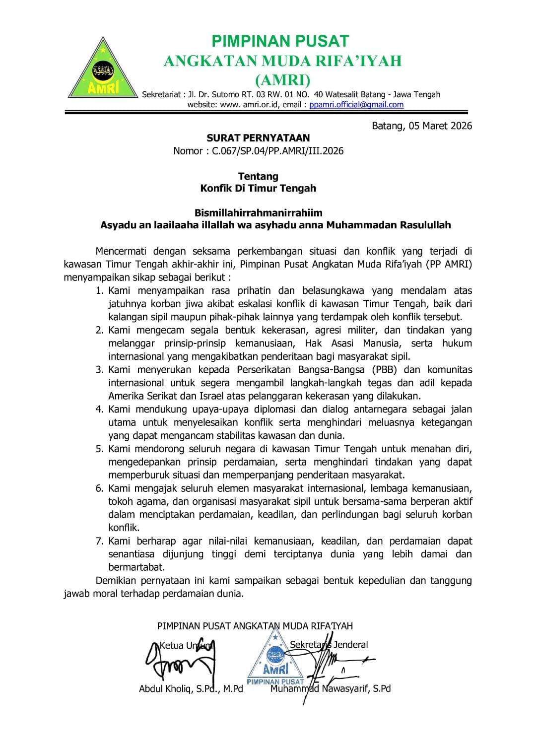 Surat pernyataan ini ditandatangani oleh Ketua Umum PP AMRI Abdul Kholiq, S.Pd., M.Pd., dan Sekretaris Jenderal Muhammad Nawasyarif, S.Pd., sebagai bentuk kepedulian serta tanggung jawab moral organisasi terhadap upaya perdamaian dunia.