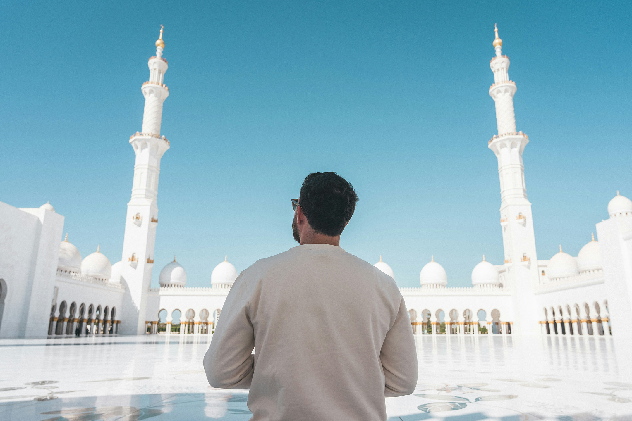 Seorang Muslim merenungi makna dunia sebagai bekal akhirat di halaman masjid. (Unsplash/bigdodzy)