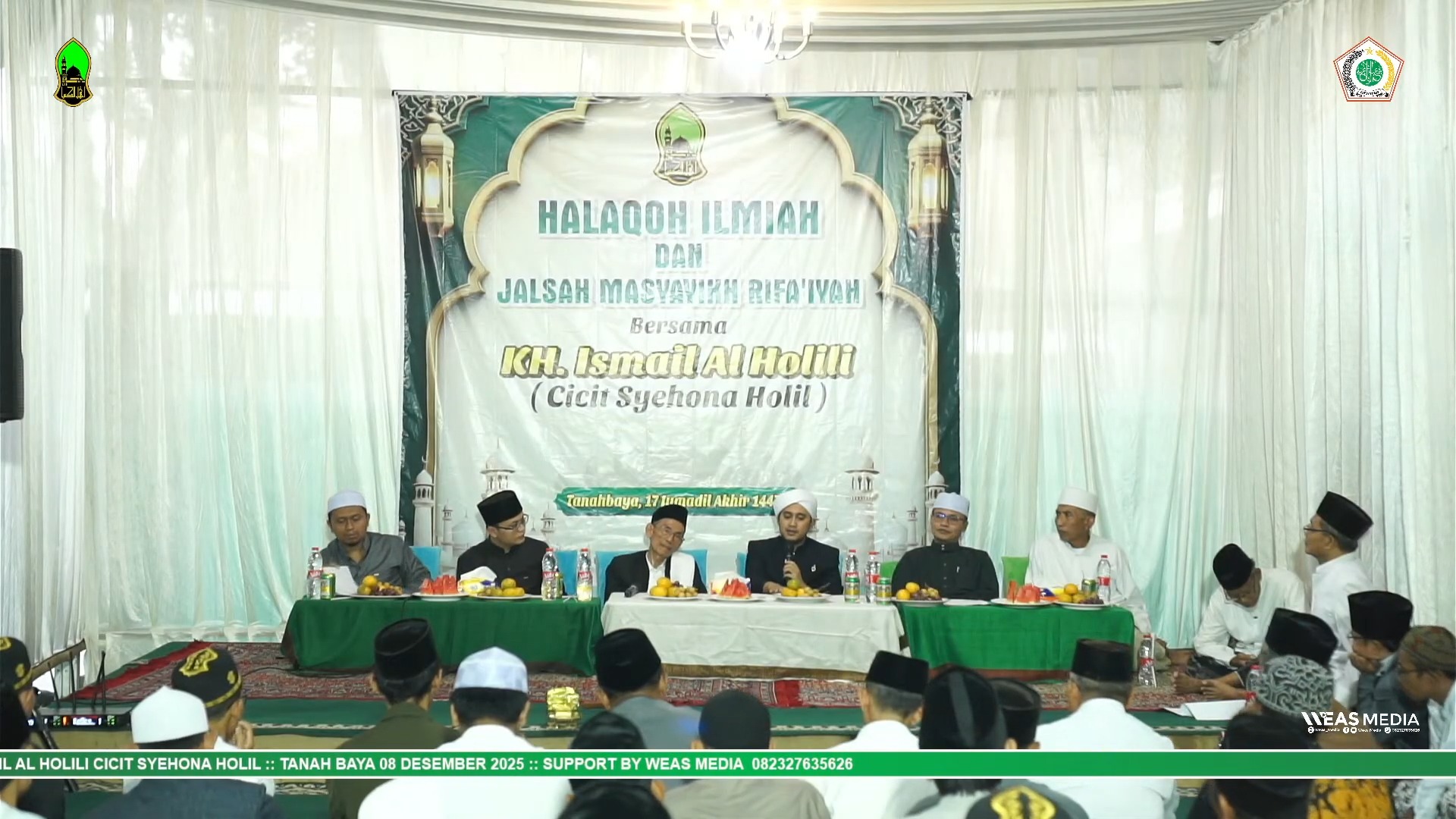 Pemalang — Halaqoh Ilmiah dan Jalsah Masyaikh Jam’iyah Rifa’iyah berlangsung dengan khidmat dan penuh antusiasme. Acara diselenggarakan di Perempatan Desa Tanahbaya, Jl. Pesantren No. 1 Tanahbaya, Randudongkal, Pemalang, pada Senin, 8 Desember 2025 / 17 Jumadil Akhir 1447 H, mulai ba’da Isya’ hingga selesai. Kegiatan ini menghadirkan KH. Ismail Al Holili, cicit Syaikhona Kholil Bangkalan, sebagai narasumber utama. Selain itu, hadir pula Dr. KH. Mukhlisin Muzarie, MA (Ketua Umum Pimpinan Pusat Rifa’iyah), jajaran masyaikh, habaib, dan peserta dari berbagai daerah.