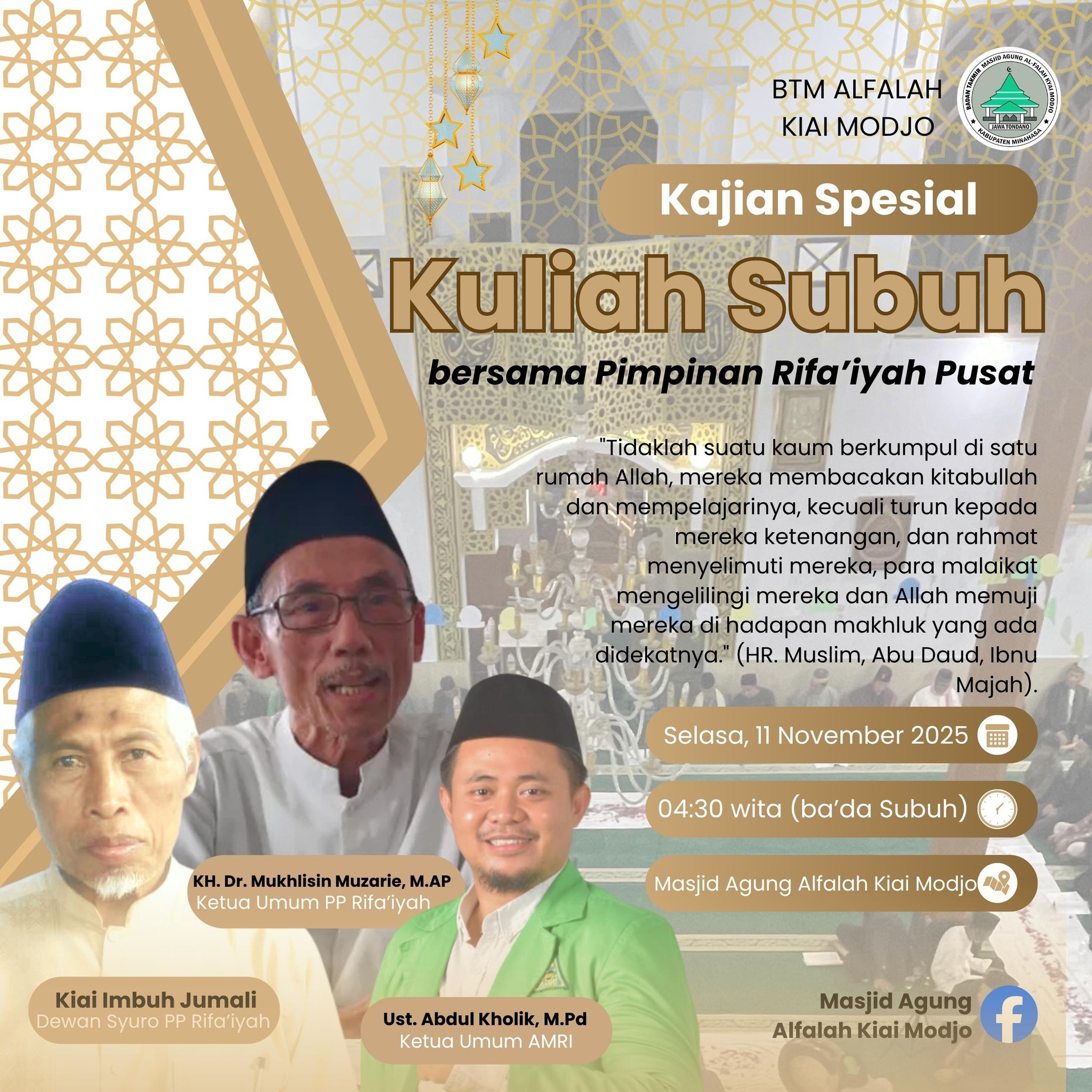 Tondano — Selasa, 11 November 2025, keluarga besar jam’iyah Rifaiyah menggelar Kajian Spesial Kuliah Subuh bersama Pimpinan Rifa’iyah Pusat di Masjid Agung Al-Falah Kyai Modjo, Tondano, Kabupaten Minahasa, Sulawesi Utara.
