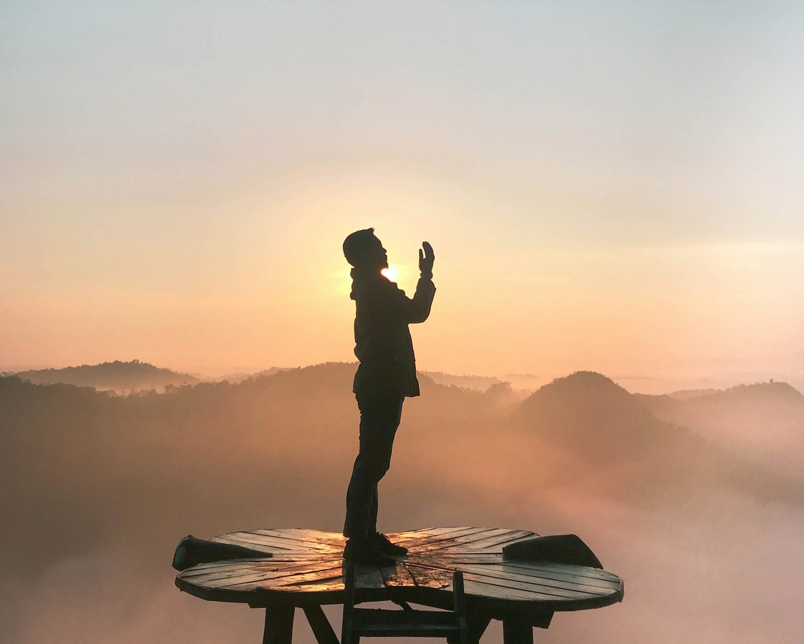 Seorang pria berdoa saat matahari terbit, melambangkan momen syukur dan perenungan. (Unsplash/negafolk)