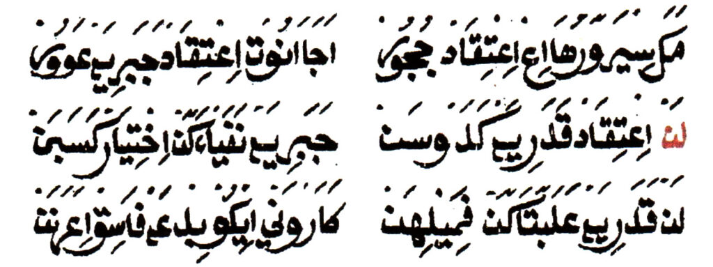 “Mazhab Jabariyah adalah keyakinan bahwa manusia tidak punya peran usaha. Dia dalam keadaan terpaksa (oleh qodrat Allah) bagaikan bulu yang beterbangan di udara bergerak ke sana kemari sesuai dengan arah angin. Mazhab Mu‘tazilah adalah keyakinan bahwa manusia yang menciptakan perbuatan-perbuatan ikhtiarnya dengan kemampuan yang telah diciptakan Allah dalam dirinya. Karena Mu‘tazilah mengatakan dengan kemampuan yang diciptakan Allah dalam dirinya mereka tidak dianggap kafir menurut pendapat al-ashah. Jabariyah berlebihan dalam menafikan usaha, sedangkan Mu‘tazilah berlebihan dalam menetapkan usaha. Adapun Ahlus Sunnah berada di tengah-tengah di antara keduanya. Sebaik-baik perkara adalah pertengahannya, maka mazhab Ahlus Sunnah bagaikan air susu murni yang terasa lezat bagi para peminumnya, yang telah keluar dari kotoran dan darah.”