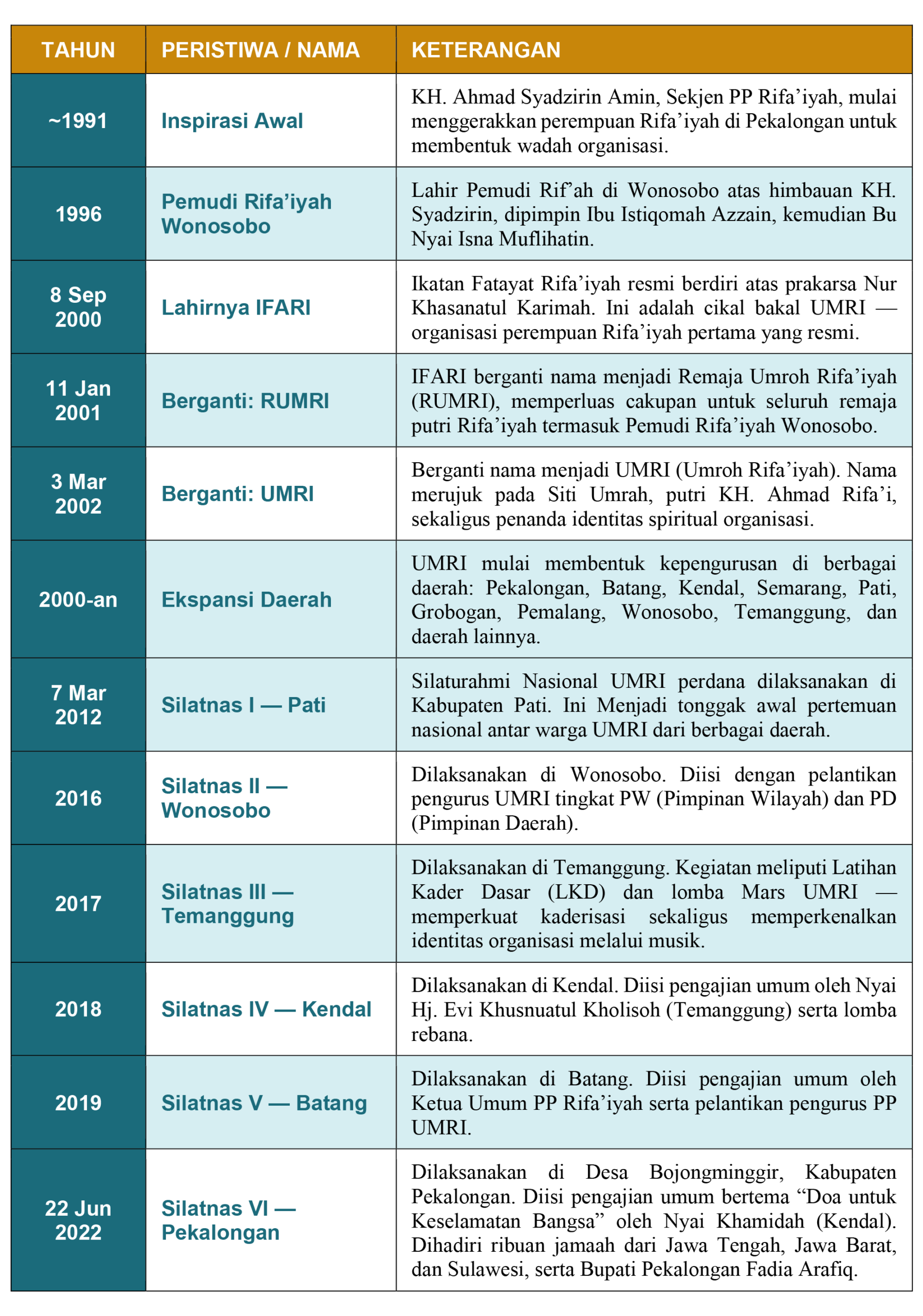Lalu, pada 3 Maret 2002, nama kembali berganti menjadi UMRI — Umroh Rifa’iyah. Pemilihan nama ini bermakna ganda: merujuk pada nama putri KH. Ahmad Rifa’i, yaitu Siti Umrah, sekaligus menegaskan dimensi spiritual organisasi ini sebagai perjuangan menuju ridha Allah.