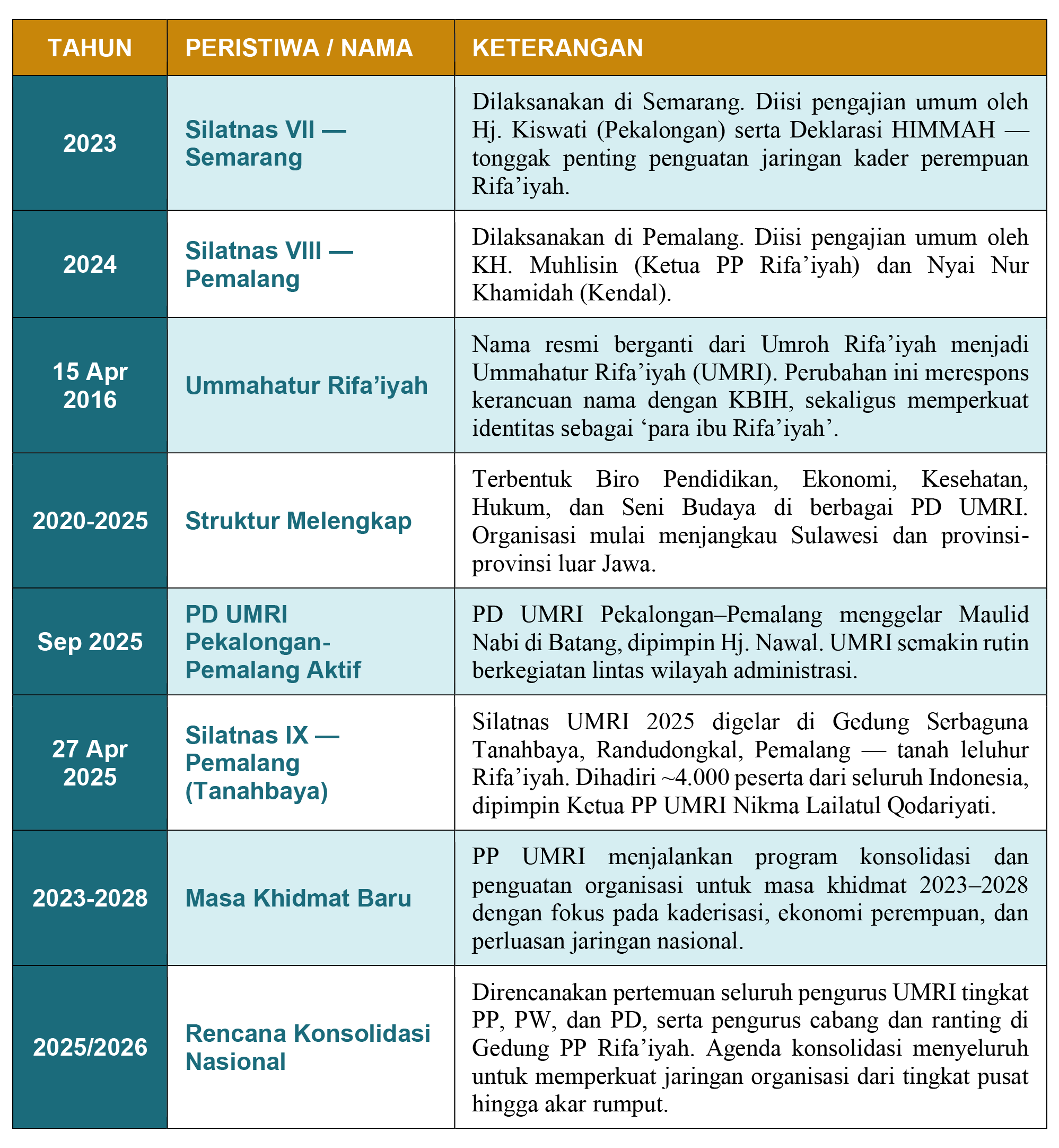 Namun tanpa wadah yang resmi, sumbangsih perempuan Rifa’iyah itu tak terdokumentasi, tak terstruktur, dan tak berdaya secara kolektif. Itulah gap yang hendak diisi oleh UMRI.