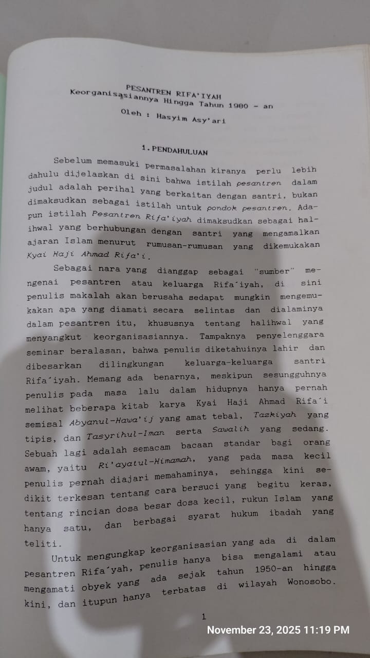 Sebagai nara yang dianggap sebagai “sumber” mengenai pesantren atau keluarga Rifa’iyah, di sini penulis makalah akan berusaha sedapat mungkin mengemukakan apa yang diamati secara selintas dan dialaminya dalam pesantren itu, khususnya tentang ihwal yang menyangkut keorganisasiannya. Tampaknya penyelenggara seminar beralasan, bahwa penulis diketahuinya lahir dan dibesarkan di lingkungan keluarga-keluarga santri Rifa’iyah. Memang ada benarnya, meskipun sesungguhnya penulis pada masa lalu dalam hidupnya hanya pernah melihat beberapa kitab karya Kyai Haji Ahmad Rifa’i semisal Abyanal-Hawa’ij yang amat tebal, Tadzkiyah yang tipis, dan Syarihul Iman. Sebuah lagi adalah semacam bacaan standar bagi orang awam, yaitu Ri’ayatul Himmah, yang pada masa kecil penulis pernah diajari memahaminya, sehingga kini sedikit terkesan tentang cara bersuci yang begitu keras, tentang rincian dosa besar dosa kecil, rukun Islam yang hanya satu, dan berbagai syarat hukum ibadah yang teliti.