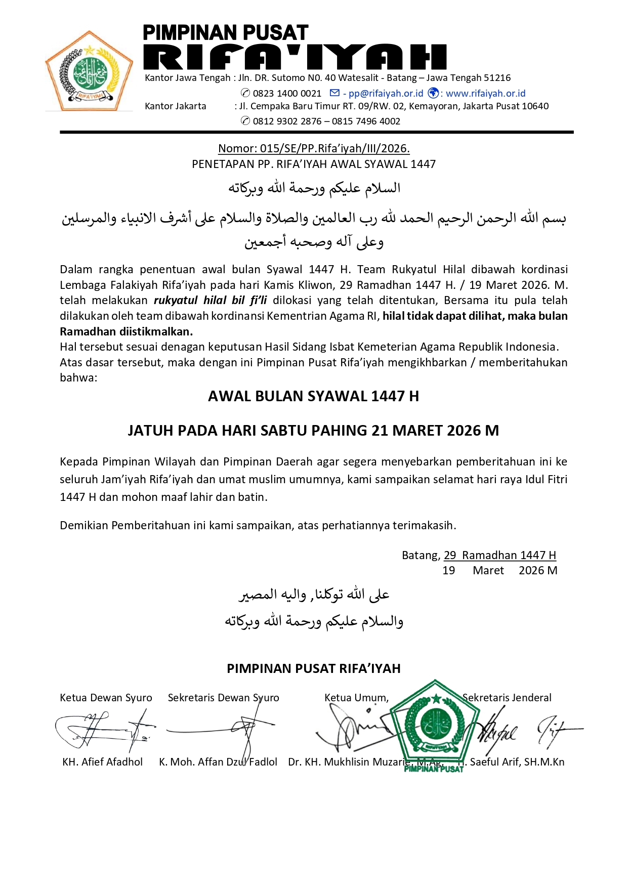 Batang – Pimpinan Pusat Rifa’iyah secara resmi mengikhbarkan awal bulan Syawal 1447 Hijriah jatuh pada hari Sabtu Pahing, 21 Maret 2026 M. Pemberitahuan ini diumumkan melalui surat edaran bernomor 015/SE/PP.Rifa’iyah/III/2026 tertanggal 19 Maret 2026.