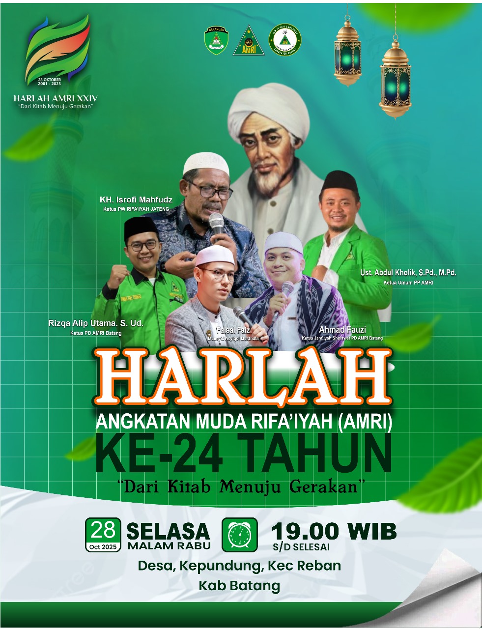 Batang, Rifaiyah.or.id — Dalam rangka memperingati Hari Lahir (Harlah) ke-24 Angkatan Muda Rifa’iyah (AMRI), Ketua Umum Pimpinan Pusat AMRI, Gus Abdul Kholiq, M.Pd., AH., melaksanakan Safari Dakwah ke sejumlah daerah yang memiliki nilai historis bagi perjalanan perjuangan KH Ahmad Rifa’i.