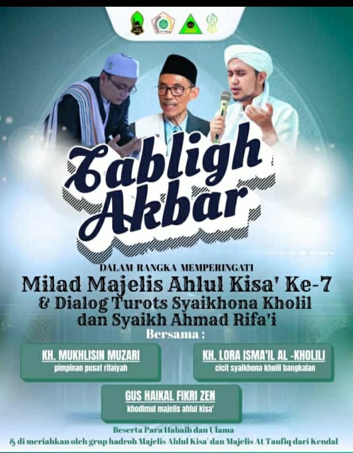 Pemalang — Majelis Ahlul Kisa’ akan menyelenggarakan Tabligh Akbar dalam rangka memperingati Milad Majelis Ahlul Kisa’ ke-7 yang dirangkaikan dengan Dialog Turots Syaikhona Kholil dan KH. Ahmad Rifa’i, pada Senin malam, 8 Desember 2025 / 17 Jumadil Akhir 1447 H, ba’da Isya’.